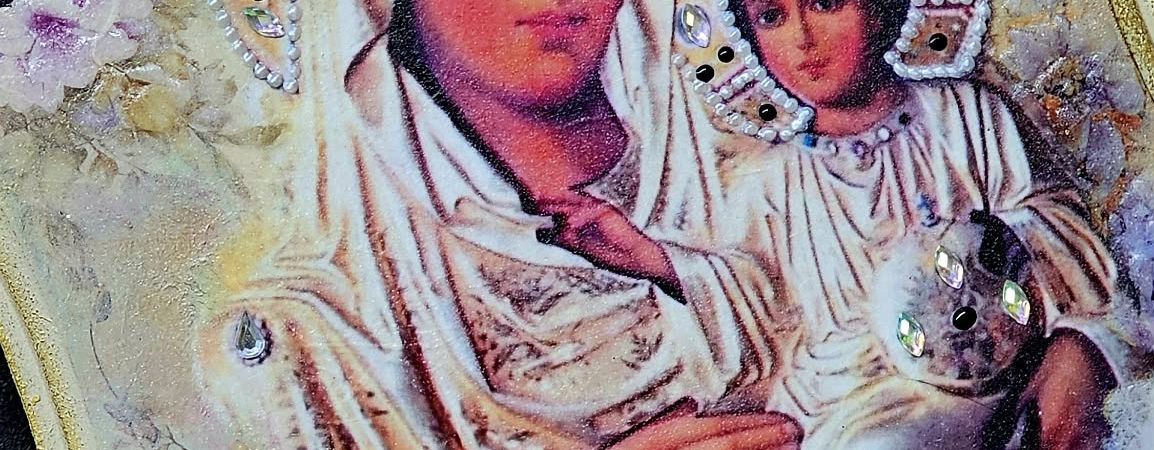 Παναγία, τυλιγμένη απαλά μέσα σε άνθη και φωτεινές αποχρώσεις αναδεικνύοντας τη γαλήνη και την τρυφερότητα της μορφής της, δημιουργώντας μια αίσθηση ηρεμίας και ζεστασιάς.